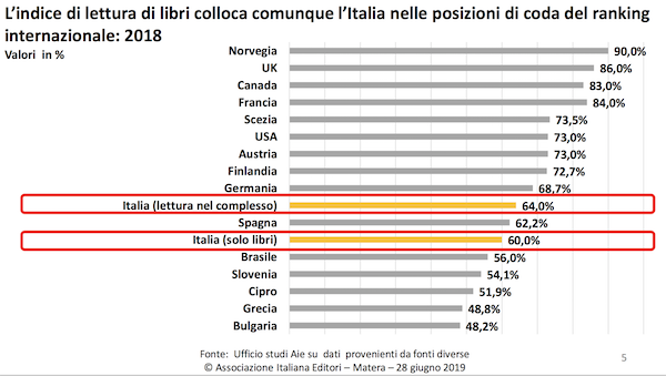 2019年,意大利出版商協(xié)會成立150周年。7月28日,協(xié)會主席Ricardo Franco Levi發(fā)表講話,題為“意大利出版社現(xiàn)狀、讀者情況、銷售情況以及新的電子化領(lǐng)域”(若無特別指出,以下數(shù)據(jù)皆來自于該文件)。講話的開頭便援引了經(jīng)濟合作與開發(fā)組織的2015年P(guān)ISA項目數(shù)據(jù)。