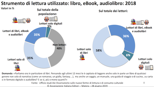 如果細分的話,2018年,在64%的閱讀人群中,如下圖左側(cè)餅狀圖,35%的人群只讀紙質(zhì)書,22%的人群既讀紙質(zhì)書也讀其它形式的書籍(此處意大利出版社協(xié)會似乎又犯了一個錯誤,將22%寫成了35%;正式文件中小錯誤頻頻,反映了意大利人的民族性格:“不拘小節(jié)”),即電子書與有聲書,還有3%的讀者只讀電子書與有聲書。下圖右側(cè)顯示,在所有讀者中,58%只讀紙質(zhì)書,36%為綜合型讀者,6%則為只讀電子書與有聲書的“電子化”讀者。