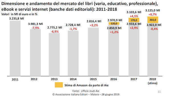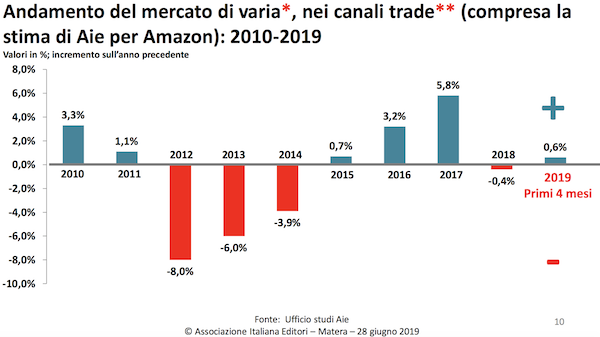 就圖書市場而言,除去教材等專業(yè)型書籍,意大利出版商協(xié)會給出了2010年至2019年十年間的銷量數(shù)據(jù),同時算上了估算的亞馬遜數(shù)據(jù):