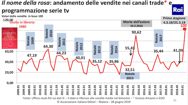 意大利出版社協(xié)會的數(shù)據(jù)是多方位的,有意思的是,協(xié)會還列出了書籍周邊市場。比如,以翁貝托·??频拿睹倒宓拿帧罚ɑ蜃g《玫瑰之名》)而言,協(xié)會給出了該書從2009年至2019年3月的銷售波動數(shù)據(jù),以2019年3月的銷量為基準值100: