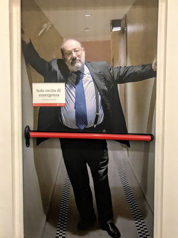 佩魯賈的la Feltrinelli書店中一景:緊急出口上貼著翁貝托·埃科的巨像,并寫著:“只有緊急情況才能離開”,似乎暗指:若無急事(哪怕疫情來臨?),請勿離開閱讀的世界。? 周之桓