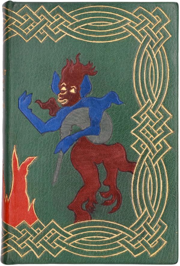 《一個(gè)青年藝術(shù)家的畫像》( A Portrait of the Artist as a Young Man),倫敦:Jonathan Cape Ltd.,1928年六刷(此著初版由倫敦自我主義者出版社于1916年推出)。此冊為喬伊斯題贈(zèng)本,贈(zèng)言曰:“贈(zèng)George Cosgrove,詹姆斯·喬伊斯,1929年6月5日,巴黎?!迸c《尤利西斯》和《芬尼根守靈夜》均推出喬伊斯簽名限印版不同,此著喬伊斯簽名甚罕見。這是美國著名裝幀家重新裝幀的作品。綠色哈麥丹山羊皮全皮裝。書封的裝幀設(shè)計(jì)靈感來自愛爾蘭中世紀(jì)手稿里首字母的彩飾圖案。燙金印中世紀(jì)凱爾特結(jié)為邊框,框中以彩色鑲皮呈現(xiàn)象征沖動(dòng)的魔鬼和地獄的火焰。包布書匣上是褐色貼皮的都柏林城市天際線。