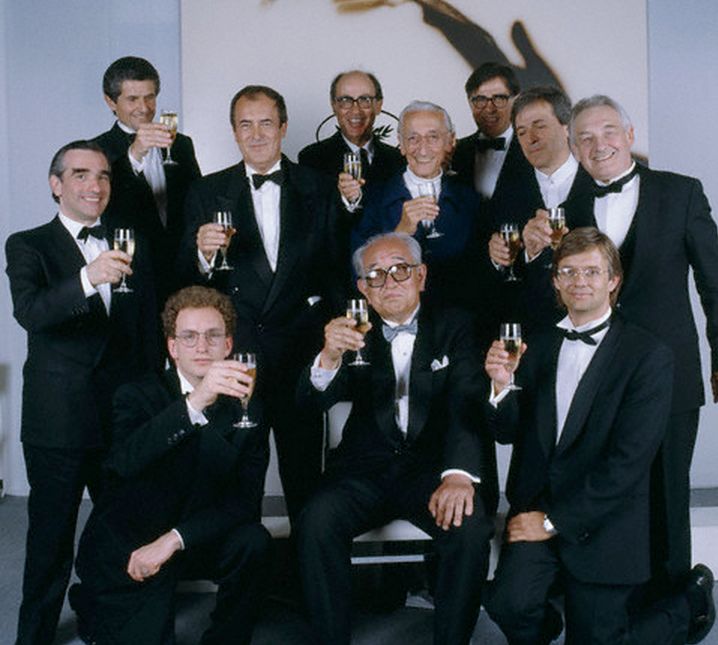 黑澤明(前排中)獲得奧斯卡終身成就獎后,諸多知名導(dǎo)演向他表示祝賀。小編認(rèn)出合影中有馬丁·斯科塞斯、伯納德·貝托魯奇、史蒂文·索德伯格