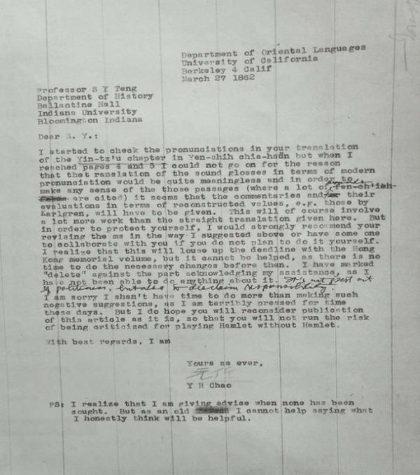 1962年3月27日,趙元任回復(fù)鄧嗣禹,關(guān)于討論《顏氏家訓(xùn)》翻譯問題的信札。