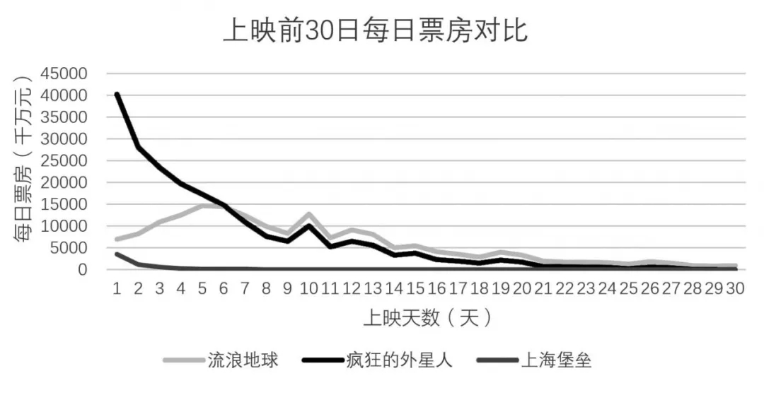 圖2 電影《流浪地球》《瘋狂的外星人》《上海堡壘》上映前30日每日票房對(duì)比