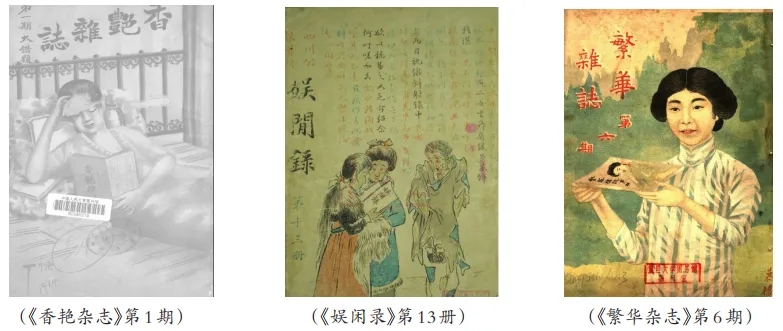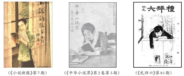 可以看到,從1914年至1915年,在《小說(shuō)新報(bào)》《中華小說(shuō)界》《禮拜六》《香艷雜志》《娛閑錄》《繁華雜志》等小說(shuō)雜志(或主要刊登小說(shuō)作品)的封面上,都出現(xiàn)了一個(gè)性別化了的小說(shuō)讀者,為我們連綴出了一幅民國(guó)初年女性小說(shuō)閱讀網(wǎng)絡(luò)、接受網(wǎng)絡(luò)和傳播網(wǎng)絡(luò)的全景圖畫(huà)。在前四幅封面上,閱讀的女性獨(dú)自出現(xiàn)在窗下、桌前、床邊等私人領(lǐng)域,“她們”眼簾朝下,嘴角微微上揚(yáng),手中捧著正在津津有味閱讀的,正是該雜志本身。在后兩幅圖畫(huà)中,女性成群出現(xiàn)在林蔭與戶外等公共領(lǐng)域:《娛閑錄》上的三位女性年齡各異,正聚集在一處討論著什么;而《繁華雜志》上這位手捧雜志的女子,正在將該刊遞向他人。圖片上隱去的這位“對(duì)面人”,是她的愛(ài)人、閨友還是其他什么人呢?這為讀者留下了豐富的想象空間。雜志的封面常常被看作是一個(gè)刊物的形象代言人,“女性讀者”的出現(xiàn),構(gòu)成了“女性”與“小說(shuō)”關(guān)系的兩種隱喻:一方面,這些讀書(shū)女性的倩影被繪制成封面圖畫(huà),通過(guò)購(gòu)買(mǎi)和閱讀,走向一個(gè)更加廣闊的公共空間;另一方面,它也將隱含在閱讀空間中的女性讀者物品化、風(fēng)景化、公共化,進(jìn)而與雜志的商品屬性實(shí)現(xiàn)某種“同構(gòu)”。從這樣一個(gè)角度來(lái)講,“女性”與“小說(shuō)”堪稱一而二、二而一,共同打造了一個(gè)都市商品文學(xué)的風(fēng)景線。