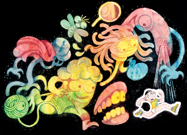 澎湃新聞:這本書里您畫了大量“睡魔怪”的形象,每次出現(xiàn)幾乎都不重復(fù),我覺得比較有意思的是,除了蟲子、雷電這種孩子在生活中比較容易害怕的東西,還有大量像牙膏、花灑、哨子、馬桶、鬧鐘這些看似無害的日用品,有一幅畫面里還出現(xiàn)了奶奶笑呵呵織著毛線的形象。為什么會這樣設(shè)計呢?您有參考過類似兒童心理學(xué)之類的專業(yè)材料還是更多地從個人經(jīng)驗或是孩子的講述中取材?