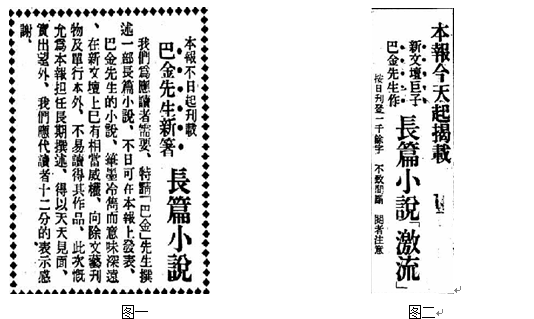 在新文學影響持續(xù)發(fā)酵的1930年代,《時報》此舉一方面體現(xiàn)了其“報界先鋒”的地位,大舉革新,刊載新文學小說。另一方面,《時報》連載剛剛走向成熟的新文學長篇小說,很明顯是含有借新文學作家名聲擴大報紙影響力,進而提高報紙銷量的用意?!都ち鳌奉A告中稱巴金為“新文壇巨子”,作品不易讀到。巴金卻否定道:“這明明是吹牛。我當時只出版了兩本中篇小說,發(fā)表過十幾個短篇。文學是什么,我也講不出來,究竟有沒有進入文壇,我自己也說不清楚,哪里來的‘巨子’?”[32]