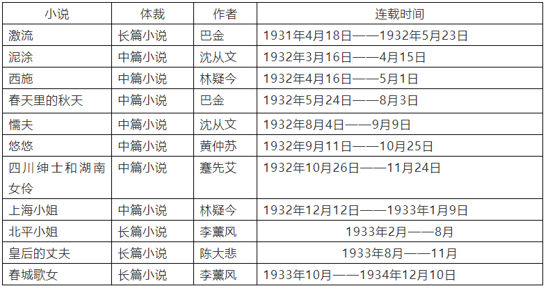這一切對于報館而言又意味著什么?以下根據(jù)筆者整理的1931年4月——1934年12月《時報》連載小說情況表,嘗試對《激流》連載結束后,《時報》報館怎樣調整連載小說這一問題作具體分析: