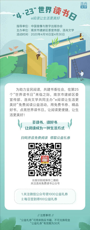 在第25個“世界讀書日”即將來臨之際,由中國音像與數(shù)字出版協(xié)會指導(dǎo),江蘇省南京市建鄴區(qū)委宣傳部與連尚文學(xué)共同主辦的“e閱讀讓生活更美好”免費閱讀公益活動正式啟動,該活動也是“2020年中國數(shù)字閱讀云上大會”系列活動之一。