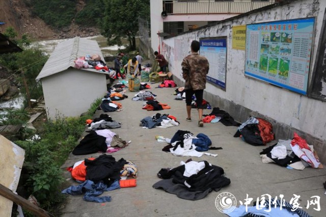 向村民分發(fā)外界捐贈(zèng)的舊衣服。