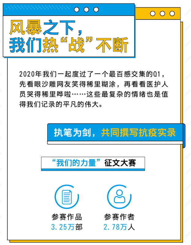 除了內(nèi)容創(chuàng)作和閱讀的爆發(fā)之外,網(wǎng)絡(luò)文學(xué)行業(yè)也在身體力行地用筆助力抗疫。2月9日,閱文集團(tuán)啟動(dòng)“我們的力量”征文大賽,面向旗下所有原創(chuàng)文學(xué)站點(diǎn)及網(wǎng)文寫(xiě)作者,征集充滿力量的平凡身影背后的戰(zhàn)“疫”故事。目前,參賽作者達(dá)27800部,參賽作品32500部。