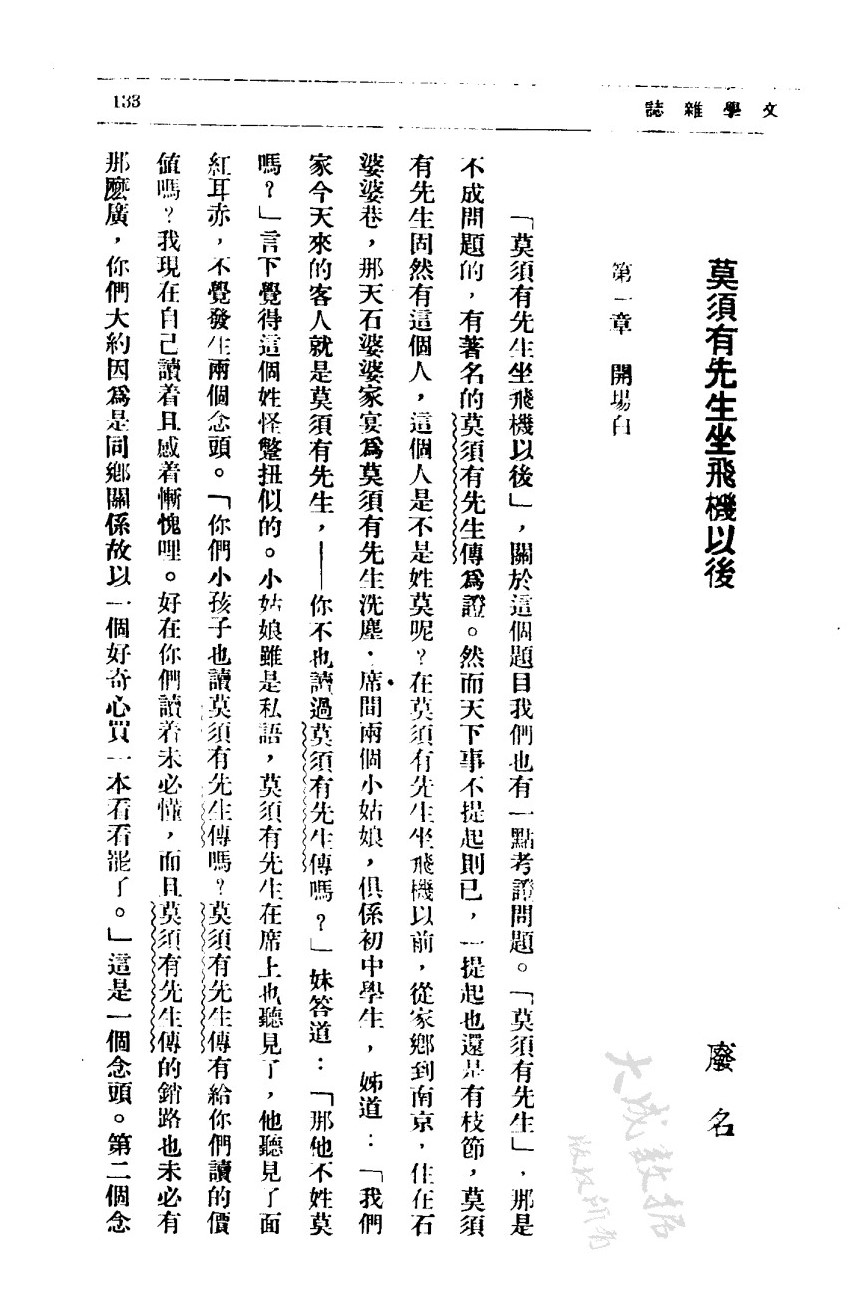 《莫須有先生坐飛機(jī)以后》“開(kāi)場(chǎng)白” 初刊《文學(xué)雜志》1947年6月第2卷第1期