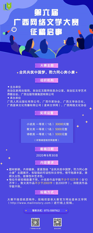 第六屆廣西網(wǎng)絡(luò)文學(xué)大賽自4月啟動(dòng),投稿截止時(shí)間為2020年9月30日,以官方網(wǎng)站麥林文學(xué)網(wǎng)線上投稿為主。歡迎廣大作家、文學(xué)愛好者參與廣西網(wǎng)絡(luò)文學(xué)大賽。