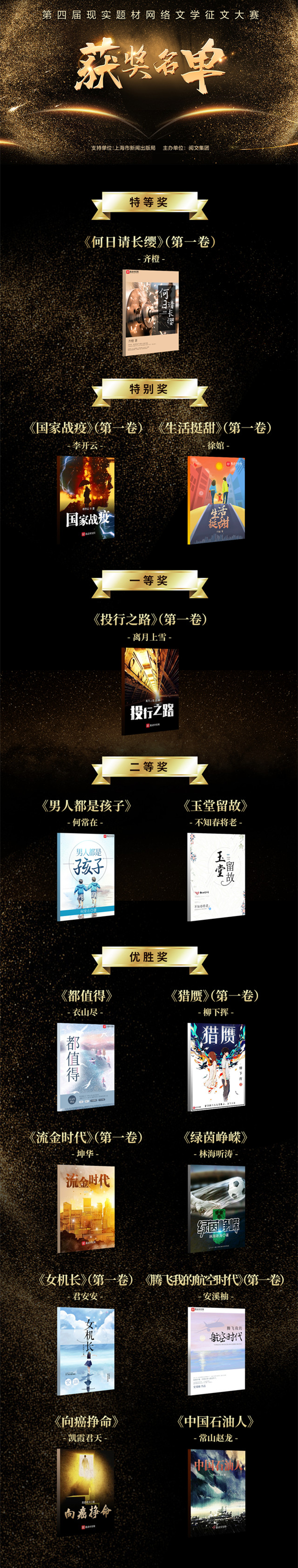 5月1日,由上海市新聞出版局指導(dǎo),閱文集團(tuán)旗下多家原創(chuàng)文學(xué)網(wǎng)站聯(lián)合主辦的第四屆全國(guó)現(xiàn)實(shí)題材網(wǎng)絡(luò)文學(xué)征文大賽獲獎(jiǎng)名單公布。聚焦中國(guó)工業(yè)發(fā)展史的《何日請(qǐng)長(zhǎng)纓》獲特等獎(jiǎng);反映金融資本行業(yè)發(fā)展的《投行之路》獲一等獎(jiǎng);根據(jù)疫情期間真實(shí)事件改編的《國(guó)家戰(zhàn)疫》、聚焦醫(yī)護(hù)工作者的《生活挺甜》獲特別獎(jiǎng)。