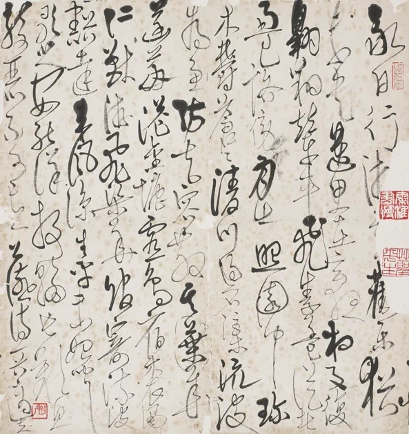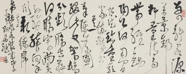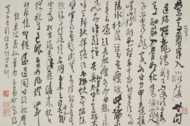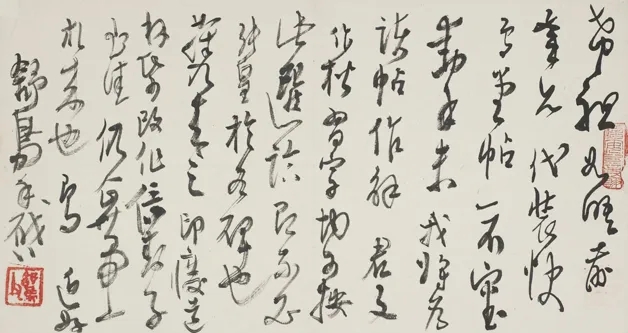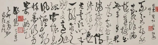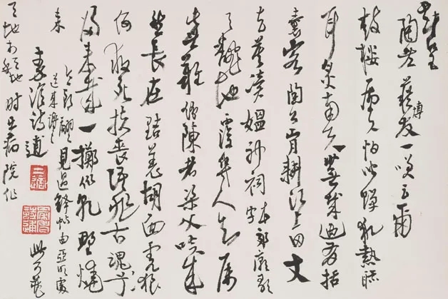 靜靜凝視高二適的書(shū)法遺墨,那靈異的墨線,似高猿悲叫,亂水潛奔,這是流淌在古典詩(shī)文和經(jīng)典碑帖中的心靈對(duì)晤,是意與古會(huì)的神異契合。在筆力彌滿、意態(tài)天矯,行氣淋漓的筆勢(shì)中透映出一位傳統(tǒng)文人的自我風(fēng)神。從“赴速急就稱(chēng)奇觚,鬼哭神驚運(yùn)思初”的詩(shī)句里,流露出他作書(shū)時(shí)“筆所未到氣已吐”的豪邁心象。高二適的書(shū)法意象以氣勢(shì)開(kāi)張、書(shū)蘊(yùn)“詩(shī)意”為基調(diào),以其精湛的筆墨古法、深厚淵深的文史修養(yǎng)和特立高潔的文人風(fēng)骨幻化熔鑄,開(kāi)古典主義之新境,堪稱(chēng)傳統(tǒng)書(shū)法草書(shū)一脈的浪漫主義大師。