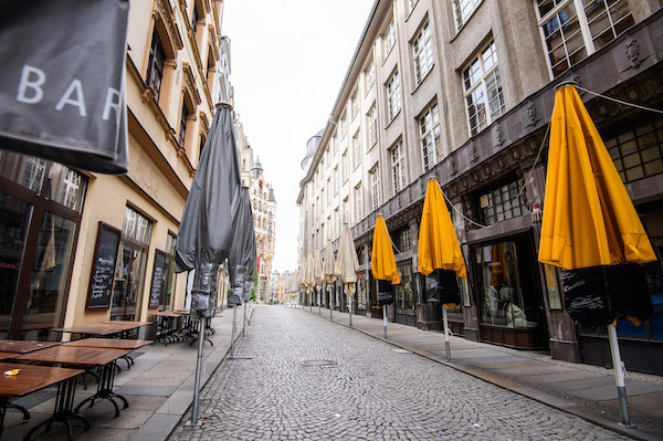 4月4日在德國東部城市萊比錫拍攝的一條空無一人的餐飲街(圖片來源:新華社)