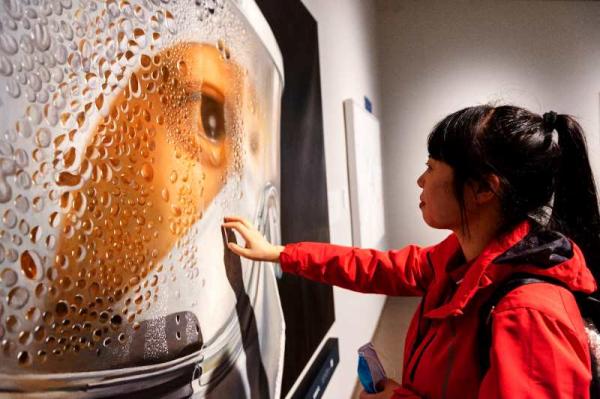 4月28日,畫中人貴州援鄂的護(hù)士長龍艷在中華藝術(shù)宮撫摸作品《抗疫天使——2020年2月9日,武漢,晴》中的自己