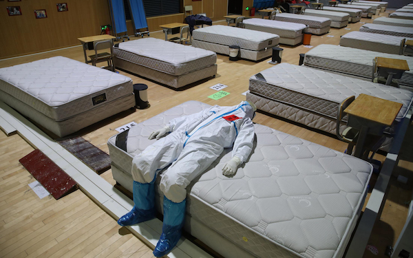 這張《如釋重負(fù)》是3月9日晚拍攝的,3月10日是武漢方艙醫(yī)院休艙的日子,作為記者出于職業(yè)的敏感,我覺得最后一晚是非常重要的節(jié)點(diǎn)。當(dāng)時華山醫(yī)療隊(duì)所有成員都進(jìn)入方艙醫(yī)院,我也跟著他們一起,但照片中的這位醫(yī)生是武漢人民醫(yī)院的醫(yī)生,他主要是輔助華山醫(yī)院專家治療方艙醫(yī)院的患者。我突然看到這位醫(yī)生在把病人都送出去了后,他就躺下來。當(dāng)時我在拍其他的東西,看到他后,我覺得他就像一個宇航員,經(jīng)歷了漫長的飛行,突然落地到地球的感覺,這個畫面非常打動我,我就拿一把椅子站在上面拍下了他,整個過程大約持續(xù)一分鐘。他看到我拍覺得不好意思,就默默出去了。