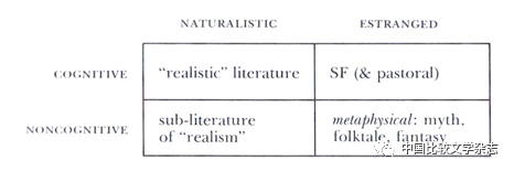 因此,傳統(tǒng)的現(xiàn)實主義文學(xué)就落在左上角,而比如神話、民間傳說和魔幻小說落在右下角,而科幻便落在右上角。