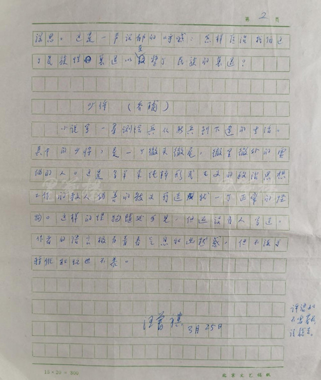 如上文所述,汪曾祺被聘為此次活動評委的時間是1988年11月,那么這個手稿的寫作時間就應該是次年即1989年的3月25日了。因為這三則評語的“出土”,今后研究者在重新編撰或修訂汪曾祺年譜時就應該補上這一筆才是。