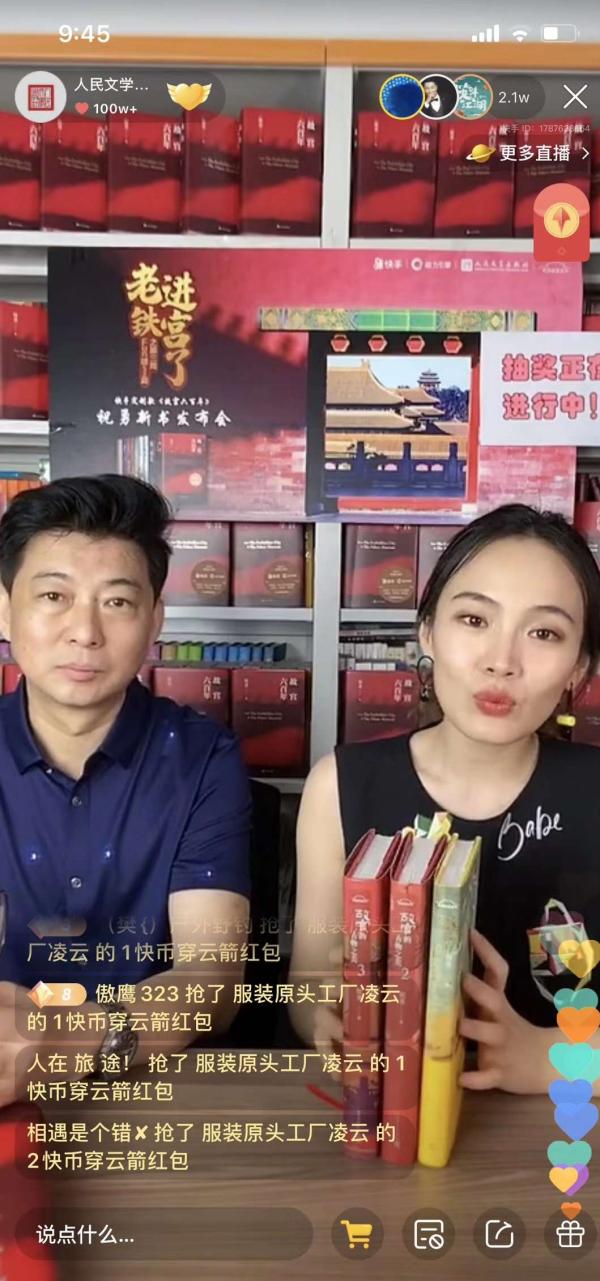 5月25日18:30,祝勇在快手平臺(tái)以線上直播的形式舉行《故宮六百年》的新書云發(fā)布會(huì)。直播活動(dòng)也邀請(qǐng)到了作家安意如、人民文學(xué)出版社社長(zhǎng)助理宋強(qiáng)、插畫家常怡、演員劉曉曄、江蘇臺(tái)新聞節(jié)目主持人苑逸倫,以及快手達(dá)人開心de核桃等進(jìn)行了線上對(duì)話。這場(chǎng)直播也收獲了許多關(guān)注,直播的累積觀看人數(shù)突破18465527人,有近十三萬人同時(shí)在線觀看。