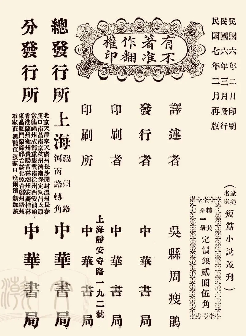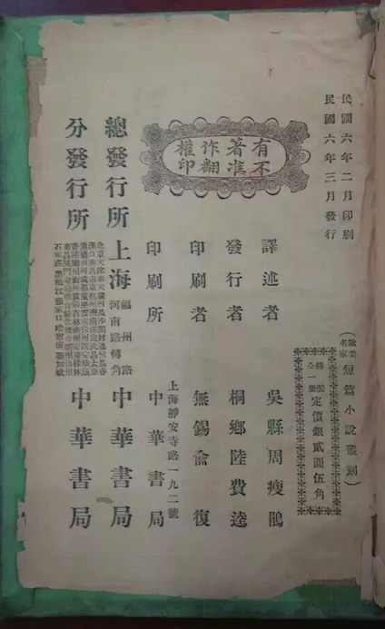 周痩鵑在《我翻譯西方名家短篇小說的回憶》一文中說:“二十二歲時,為了籌措一筆結(jié)婚的費用,就把這些年來譯成的西方各國名家短篇小說匯集攏來,又補充了好多篇,共得十四個國家的五十篇作品,定名為‘歐美名家短篇小說叢刻’?!?dāng)時中華書局當(dāng)局似乎還重視我這部‘歐美名家短篇小說叢刻’,一九一七年二月初版,先出平裝本(三冊),后又出精裝本(一冊),我自己收藏著的,就是這樣一冊精裝本。只因經(jīng)過了四十年,書脊上的隸書金字,已淡至欲無,而淺綠色的布面也著了潮,變了色了?!雹菰撐娜翁峒皶?,均稱《叢刻》,且將初版時間記為1917年2月,筆者認(rèn)為這可能是初版時間為二月之說的來源。