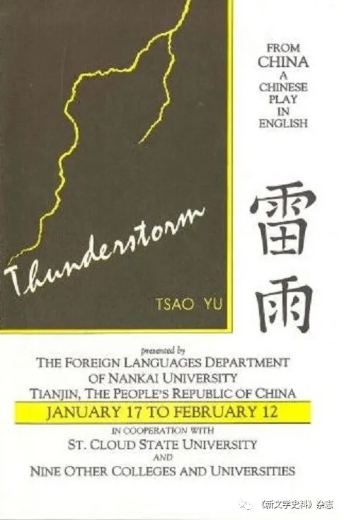 1986年1月,南開大學(xué)外文系英語專業(yè)學(xué)生組成的《雷雨》劇組在副校長王大璲的率領(lǐng)下,赴美國作訪問演出。由費(fèi)希爾導(dǎo)演的英文話劇《雷雨》在美國演出伊始,他做了一個意味深長的巡演宣傳單(說明),宣傳單上寫道,“南開學(xué)生排演英文話劇《雷雨》的想法來自于他們過去就排演過這出話劇。南開領(lǐng)導(dǎo)和州立圣克勞德大學(xué)校長麥克·唐納德先生通信一起商討了社團(tuán)這次出國巡演的各項事宜。這是中國第一次派一個大學(xué)生代表團(tuán)到國外去演出,也是南開話劇團(tuán)第一次用英語演出《雷雨》。對學(xué)生來說,他們也是第一次離開他們的祖國,而對我來說,這是我真正有過的第一個好主意。對于你們觀眾來說,我們希望你會喜歡由很多中國小演員演出的第一部中國話劇,那些非常優(yōu)雅的表演會使許多人分享他們偉大祖國戲劇的一小部分?!毖莩鰪?月17日開始到2月12日結(jié)束,在將近一個月的時間里,劇團(tuán)先后在美國明尼蘇達(dá)州的州立圣·克勞德大學(xué)(St. Cloud State University)、明尼蘇達(dá)大學(xué)德盧斯分校(University of Minnesota-Duluth)、伯米吉州立大學(xué)(Bemidji State University)、摩海德州立大學(xué)(Moorhead State University)、西南州立大學(xué)(Southwest State University)、曼卡托州立大學(xué)(Mankato State University)、威諾那州立大學(xué)(Winona State University)、阿諾卡拉姆齊社區(qū)學(xué)院(Anoka-Ramsey Community College)、明尼蘇達(dá)大學(xué)(University of Minnesota)和加州舊金山的斯坦福(Stanford University)10所大學(xué)和學(xué)院共演出了11場英文版《雷雨》,觀眾達(dá)4000余人。其中圣·克勞德州立大學(xué)在元月和二月份有兩次演出。出人意料的是演出場場爆滿,可以說演出大獲成功。美國29家英文報刊報道了《雷雨》在美國演出的消息,明尼蘇達(dá)州的一家報紙連續(xù)兩天刊登在《雷雨》劇組演出時的照片;《斯坦福時報》發(fā)表評論說:“中國《雷雨》‘襲擊’了斯特靈大廳(斯坦福大學(xué)禮堂)?!?/p>