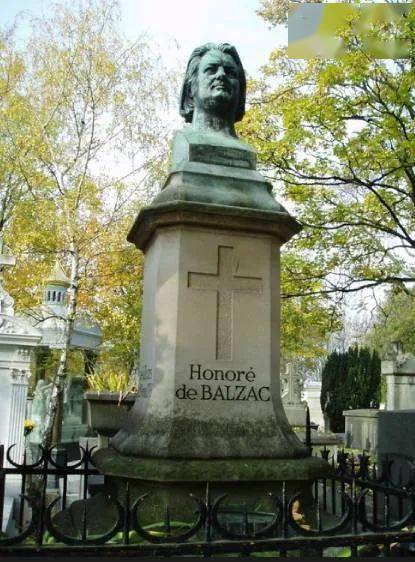 巴爾扎克的墓比較好找,因為有明顯的引導圖。在幽靜的林中小道路邊,綠色叢林中一尊 “ 大頭 ” 像映在面前,是我們熟知的蓬亂長發(fā)和略帶疑惑的目光,一眼認出這就是巴爾扎克。巴爾扎克的墓地比起周邊一些名人的墓比較簡樸,簡潔的銘文鐫刻在他半身雕像的臺座上:這里長眠著巴爾扎克和與他一起合葬的兩個女人。同去的法國朋友給我們解釋:一個是巴爾扎克終生愛戀的女人,他等了這女人 21年,因為她有丈夫。丈夫死后,女人與他結婚,婚后一年,巴爾扎克離世,另一女人,是他這位妻子與前夫所生的女兒。