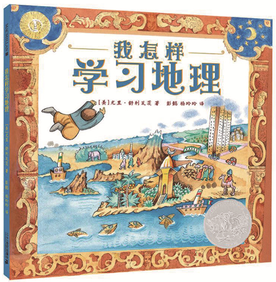 美國(guó)作家尤里·舒里瓦茨的繪本作品《我怎樣學(xué)習(xí)地理》的封面,五顏六色,豐富而美好:一個(gè)小男孩在天空飛著,眼中世界繽紛。遠(yuǎn)處高樓林立,河流蜿蜒,白云飄飄;近處城堡古老,椰風(fēng)陣陣,洲島聳立;腳下是蔚藍(lán)海洋,魚(yú)兒跳躍,舟船航行;路上騎著駱駝、舉著傘的人們,來(lái)來(lái)往往,汽車穿梭。