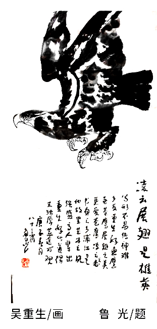 且看此雄鷹,雙目炯炯有神,鋒利的腳爪,敏銳的雙眼,傲然展翅于九天,有氣吞山河之勢(shì),威風(fēng)凜凜,雄風(fēng)八面……重生兄借雄鷹展翅來抒發(fā)“一飛沖天,雄才英豪”之志,其好友魯光先生寄語(yǔ)吳重生:“寫形不易傳神難,鄉(xiāng)友重生好畫鷹,喜蒼鷹展翅之美,更愛蒼鷹凌云之志,書畫之鄉(xiāng)浦江是他故里,藝術(shù)之風(fēng)強(qiáng)盛,高人輩出,重生好此道得天獨(dú)厚,藝途可觀?!弊阋姸擞亚樯詈?,更有墨香飄然之文雅。