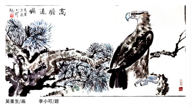 曾看過吳重生先生一幅畫作,亦是畫鷹,取名“高瞻遠(yuǎn)矚”,其風(fēng)格模仿其家鄉(xiāng)浦江著名畫家張世簡(jiǎn)先生的畫作,頗有張老神韻,著名大畫家李可染之子李小可為該畫題款。李小可出生書畫世家,也是富有盛名。且看其鷹,一雙眼炯炯有神,睥睨天下,雄心壯志可見一斑。