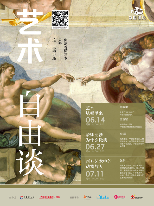 “藝術(shù)自由談”系列講座由北京萬圣書園創(chuàng)始人劉蘇里、“中國國家地理?圖書”副總編輯王瑞智、中央美術(shù)學(xué)院人文學(xué)院院長李軍、清華大學(xué)美術(shù)學(xué)院史論系教授張敢等文化藝術(shù)領(lǐng)域知名專家主講,從奈杰爾?斯皮維的《藝術(shù)創(chuàng)世記》、達(dá)?芬奇的《蒙娜麗莎》、肯尼斯?克拉克爵士的《動(dòng)物與人》等作品入手,分析人類文明與藝術(shù)之間的復(fù)雜關(guān)系。系列講座包括《藝術(shù)從哪里來》《蒙娜麗莎為什么微笑》《西方藝術(shù)中的動(dòng)物與人》三場,將從美學(xué)、藝術(shù)史、人文學(xué)等角度剖析世界知名藝術(shù)品,引領(lǐng)讀者走進(jìn)藝術(shù)的美好世界。