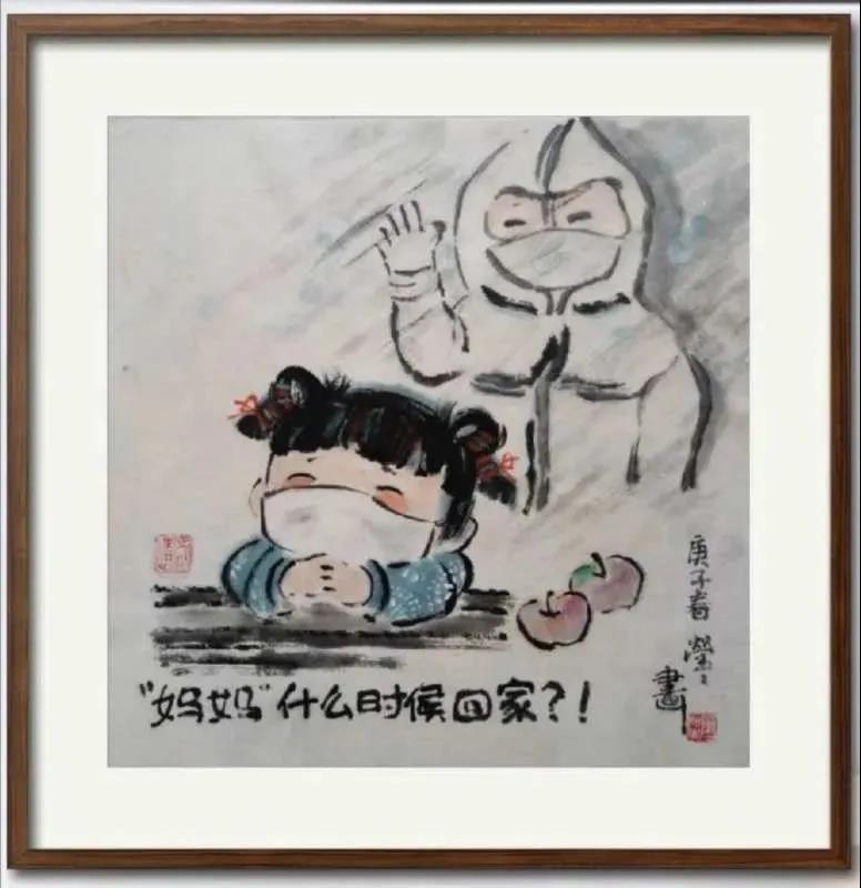 著名國(guó)畫(huà)品牌《中國(guó)娃娃》的作者、畫(huà)家楊瑩瑩創(chuàng)作了童心感人的《抗疫娃娃組畫(huà)》。談起創(chuàng)作緣起,她說(shuō):“2020年早春,我拿起筆,從孩子的視角看疫情,把我的所感、所想通過(guò)中國(guó)娃娃表達(dá)出來(lái)?!薄霸谶@次疫情中,孩子們經(jīng)歷了人間的大悲,也看到了人間的仁愛(ài)。他們天真無(wú)邪,童心異趣,充滿為人之初的真善。我用畫(huà)筆記下這段特殊的日子。”[2]