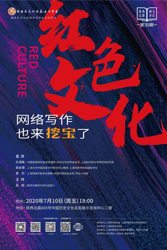 本期陜西北路網(wǎng)文講壇邀請(qǐng)到的三位嘉賓正好老、中、青三代,他們是文學(xué)史料研究者孔海珠老師,她的新作《俯仰之間——上海紅色文化記憶》4月份由上海人民出版社出版,此前她寫作了《左翼·上海(1934-1936)》《痛別魯迅》等作品;另一位嘉賓是從事文學(xué)理論研究和創(chuàng)意寫作教育的上海市美學(xué)學(xué)會(huì)副秘書長(zhǎng)、世界華文創(chuàng)意寫作協(xié)會(huì)副秘書長(zhǎng)、上海大學(xué)中國(guó)創(chuàng)意寫作研究中心張永祿教授;上海網(wǎng)絡(luò)作協(xié)理事、青年作家君天也再次做客網(wǎng)文講壇,以科幻和歷史故事寫作見(jiàn)長(zhǎng)的君天,在今年疫情期間,走訪上海的中央軍委機(jī)關(guān)舊址(靜安區(qū)新閘路613弄12號(hào))、收集彭湃烈士在滬活動(dòng)事跡、走訪四一二革命群眾犧牲處,寫出他的作品。三位嘉賓將通過(guò)他們對(duì)紅色文化與創(chuàng)作關(guān)系的思考,探討紅色文化帶給網(wǎng)絡(luò)文學(xué)的影響。