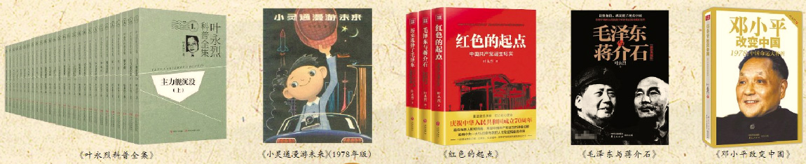 左起:《葉永烈科普全集》;《小靈通漫游未來(lái)》(1978年版);《紅色的起點(diǎn)》;《毛澤東與蔣介石》;《鄧小平改變中國(guó)》