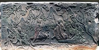 寫為“南山四皓”(圖左邊沿)的南朝畫像磚