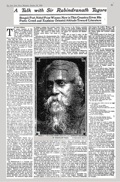 《家庭與世界》出版幾個(gè)月后,泰戈?duì)栭_(kāi)始了他的第一次環(huán)球旅行。他訪問(wèn)了日本,之后前往美國(guó),從美國(guó)西部一路演說(shuō)到美國(guó)東部,然后乘船前往歐洲,從歐洲返回印度。在接受《紐約時(shí)報(bào)》采訪時(shí),他不僅被推崇為印度文學(xué)新潮的代表,而且被視作整個(gè)東方思想的化身,向世界解釋“東方人對(duì)文學(xué)的態(tài)度”: