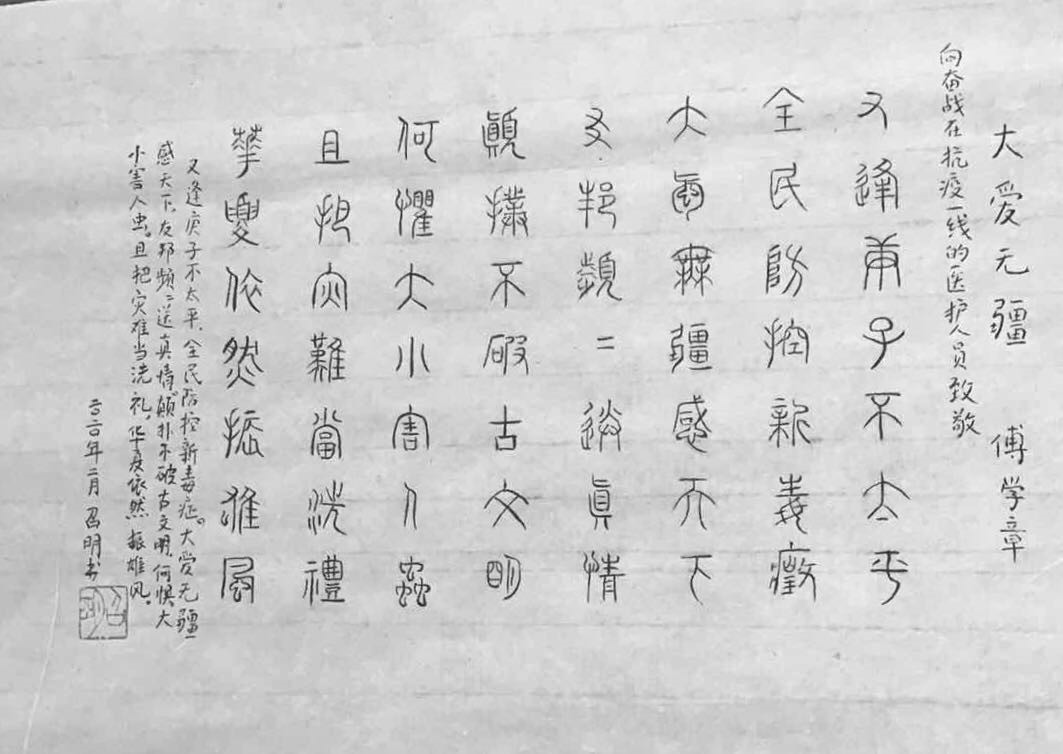 庚子年,是一個(gè)不平凡的年份。新冠肺炎疫情暴發(fā)后,中國(guó)作協(xié)廣大老同志非常關(guān)心疫情防控進(jìn)展,十分牽掛在一線抗擊疫情的醫(yī)護(hù)人員的安危。老同志們由于年齡、身體等原因無法參與一線抗疫工作,但他們始終心系國(guó)家、社會(huì),始終情牽疫區(qū)人民,他們響應(yīng)黨中央號(hào)召,努力配合做好個(gè)人防護(hù)工作;并發(fā)揮自己所長(zhǎng),以書畫的方式表達(dá)對(duì)黨和政府抗疫工作的堅(jiān)定支持,以及對(duì)廣大抗疫工作者的謳歌贊美,詮釋了共產(chǎn)黨員的初心和使命。