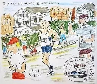 真不知道是一本正經(jīng)還是嘲諷??傊?,水丸在文章中寫(xiě)道:“那之后,箭頭確實(shí)成了我強(qiáng)有力的伙伴。畫(huà)上箭頭標(biāo)上名字,再?zèng)]什么好怕的?!彼璁?huà)筆下的跑者村上