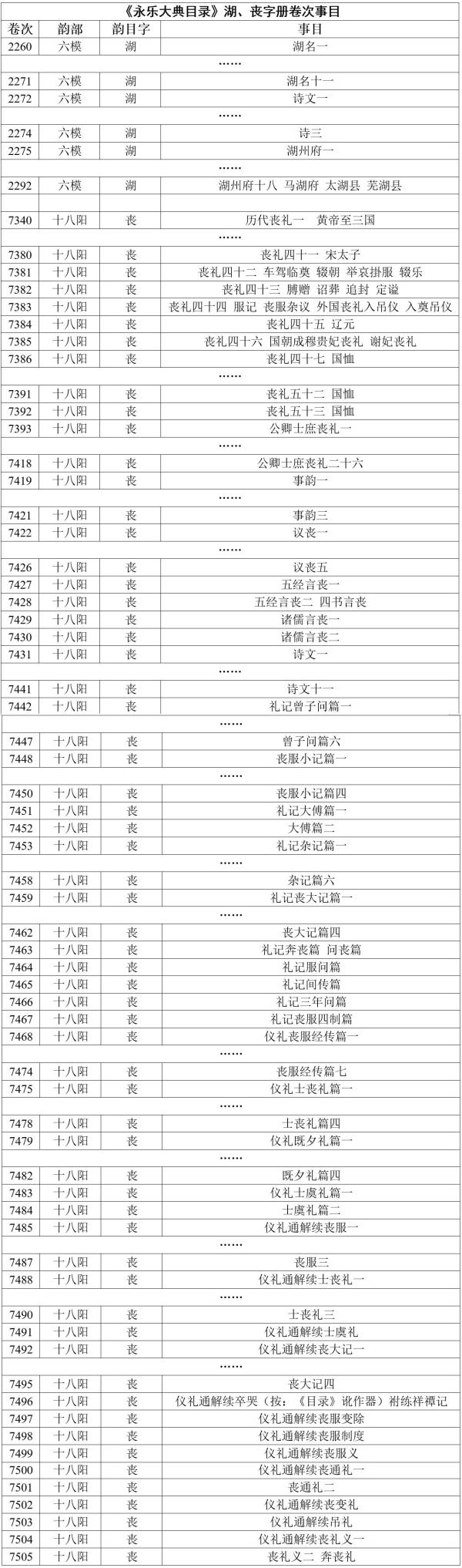 附錄:《〈永樂大典〉目錄》(姚元之抄本)湖、喪字冊(cè)卷次事目