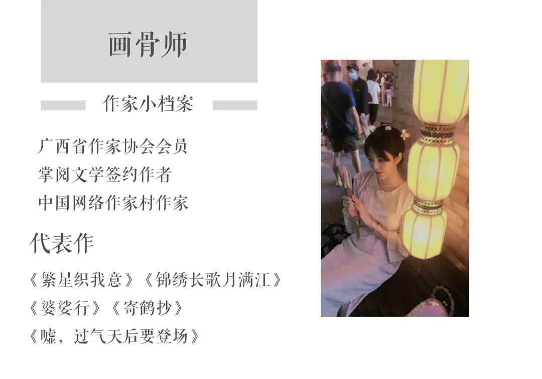 隨后,畫骨師2018年民國長篇小說《寄鶴抄》蟬聯(lián)第二屆掌閱文學(xué)創(chuàng)作大賽暨“俠世界”創(chuàng)世征文大賽,獲長篇一等獎(jiǎng);2020年中國數(shù)字閱讀云上大會上,現(xiàn)代言情小說《繁星織我意》(上)入選“2019年十佳數(shù)字閱讀作品”。畫骨師根據(jù)自己的創(chuàng)作節(jié)奏,不間斷地出版作品。目前,多部作品在影視化進(jìn)行中。