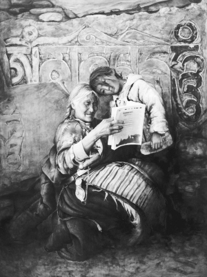 “從專(zhuān)業(yè)上來(lái)說(shuō),這幅畫(huà)題材不夠獨(dú)特,但這個(gè)畫(huà)面于我而言意義重大,我就想記下那個(gè)打動(dòng)我的珍貴瞬間。”畫(huà)中,一位老牧民手捧一本書(shū)瞇著眼睛細(xì)細(xì)端詳,孫女倚靠在旁好奇地看著,這位牧民正是格桑旺堆的妻子,而她手里的這本書(shū)就是《西藏最后的馱隊(duì)》。
