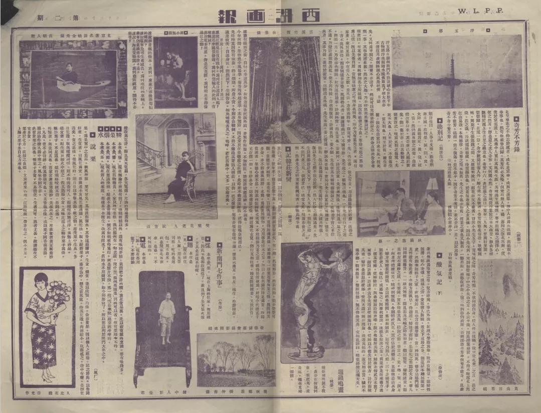 該畫報雖以西湖命名,但內(nèi)容卻不局限于西湖,涉及繪畫、電影、戲劇、文學作品及人物小傳等諸方面。創(chuàng)刊號一版有刊頭照片、訂報價目、廣告價目、編輯余沈和各界人士的祝詞,其余均為廣告;二版文字有舊夢的《紀新聞學會》、含涼的《行春橋串月》、寄塵的《記斷鴻零雁》、徐碧波的《酸氛記》、煙橋的《西湖的種種》等;圖畫有《錢塘怒潮》《塔影湖光》等風景名勝圖片,《慈愛》《田家家趣》等攝影作品,《月下》《朝曦》等繪畫作品,以及天一公司影片《立地成佛》的劇照。第二期中,文字有頹唐生的《趣刑記》、嫩波的《記韓莊新臠》、風廠的《說栗》、含涼的《新“開門七件事”》等;圖畫有《浮玉塔》《云溪竹徑》等西湖景色圖片,《人比花嬌》《曼殊遺跡畫》《題籟鳴畫》等繪畫作品,《鏡中人影》等攝影作品,以及北京著名鼓娘金秀蘭、影星王慧仙、名妓樊梨花老九的照片和影片《秋扇怨》的劇照等。