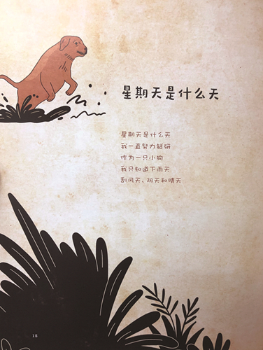 倘若問我最喜歡18首詩中的哪一首,這個問題恐怕很難回答,這18首詩哪首我都挺喜歡的,因為都是像我的孩子一樣,是我的思想和構思,加上我創(chuàng)作的時候努力投入完成的。如果說非要認可哪一首最好,我覺得恐怕是《星期天是什么天》,這首詩我還比較滿意,因為星期天大家都習以為常,在習以為常中發(fā)現(xiàn)它的非常性,這是我突發(fā)的靈感。我努力發(fā)掘小孩子和小狗對星期天與眾不同的感受,因為星期天對他們意味著釋放、歡樂、郊游,還有很多和朋友們的聚會,所以我覺得我這首詩發(fā)現(xiàn)了一個獨特的視角。星期天是什么天?就是一個小狗開心的、盼望的、特殊而平凡的一天,背后的故事是我曾經帶著大咖、小白和我們家新來的小狗牛妞到北京郊區(qū)的一個梨園去做客。在那個梨園里面,梨子碩果累累,同時草地上還有一些雞,然后三只小狗和雞們進行了猛烈的追逐,我覺得在那片郊區(qū)的田地上,小狗們的天性得到了特別大的發(fā)揮,它們是向大自然、向秋天、向梨樹上面的果子表示一種小生命的真誠的敬意,所以《星期天是什么天》就這樣完成了。