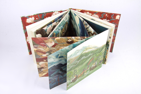 澎湃新聞:作為外行,我在《木蘭辭》繪本中看到了中國傳統(tǒng)繪畫的藝術(shù)風(fēng)格和手法,比如祥云、廣袖,不過似乎也看到了一些外來的元素和西方技法,比如頗似浮世繪的浪花,以及北歐插畫的感覺,這種印象對(duì)嗎?