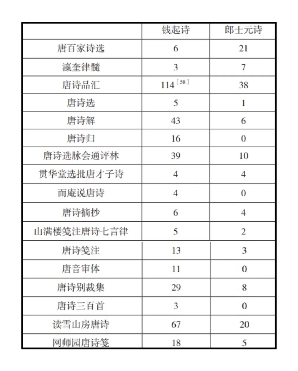 綜上所述,唐詩選本對于唐詩小家的影響是形形色色、利弊參半的。但從總體來看,在長達(dá)千年的唐詩接受史上,選本對小家作品的保存、傳播以及小家名聲的免于湮沒起著相當(dāng)積極的影響。尤其重要的是,小家們在唐詩史上的地位之確立,選本起著決定性的影響。試看一例。大歷詩人錢起與郎士元生前齊名,唐德宗貞元初年(785年),高仲武在《中興間氣集》的錢起小傳中云:“士林語曰:‘前有沈宋,后有錢郎。’”[57]此時(shí)錢、郎去世未久,可視為詩壇對二人的蓋棺論定之評(píng)。北宋歐陽修、宋祁的《新唐書·文藝傳》中轉(zhuǎn)述此語,可見后人對此種評(píng)價(jià)的認(rèn)同。有趣的是,在唐代的唐詩選本中,《中興間氣集》對二人之詩各選12首,《極玄集》對二人之詩各選8首,此外僅有《才調(diào)集》選錢詩1首而未選郎詩,可見在唐代選家的心目中,錢、郎二人確是旗鼓相當(dāng)。可是到了后代,錢、郎入選唐詩選本的多寡程度漸行漸遠(yuǎn),試據(jù)歷代較重要的唐詩選本列表如下: