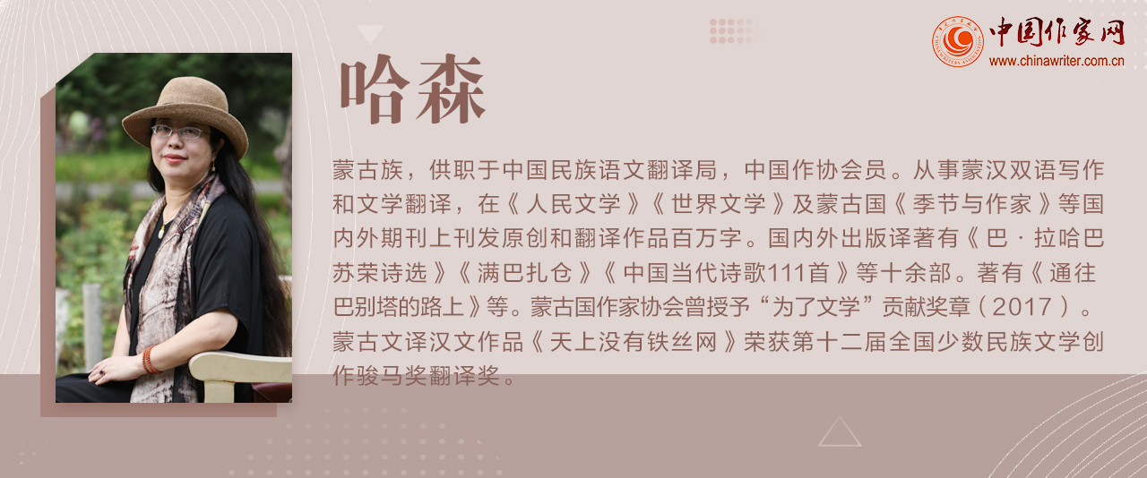 我十五年如一日地進(jìn)行文學(xué)翻譯,自始至終,全然是因?yàn)樾撵`的召喚,因?yàn)闊釔勖晒盼幕?,熱愛我所選擇的文本。希望通過我的翻譯,讓更多的人們更深刻地了解草原上的一切,從而抵達(dá)各美其美,美美與共的大好境地。我選擇翻譯為事業(yè),此生無悔。