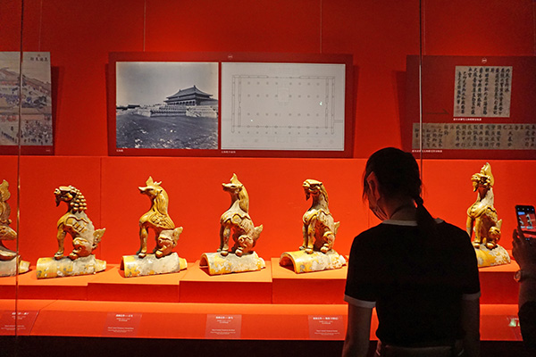 如紫禁城里著名的屋脊獸也從屋脊上搬到了展廳,這套小獸是康熙三十四年重建太和殿時的原件,每件小獸都有美好的象征寓意,尤其是最后一件——行什,只在太和殿出現(xiàn),是個孤例,也是太和殿建筑無上等級的體現(xiàn)。太和殿初建時名為奉天殿,后多次燒毀??滴跏四?1679)二月初三日再次焚毀,由于良材難求,取木艱辛,這次工程備料用了十余年;直到康熙三十四年開工,兩年后告竣,才有了今日的形制?!?nbsp;