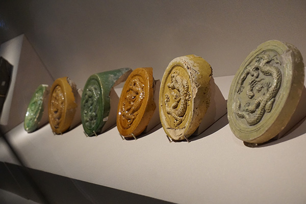 明代保存至今的琉璃瓦的部件,如下面的鳳紋、龍紋滴水,各種顏色的琉璃龍紋勾頭依舊上的龍、鳳紋雕花依舊清晰,且顏色褪去以后,別有一種不同于今天琉璃瓦部件的古樸。琉璃瓦的部件